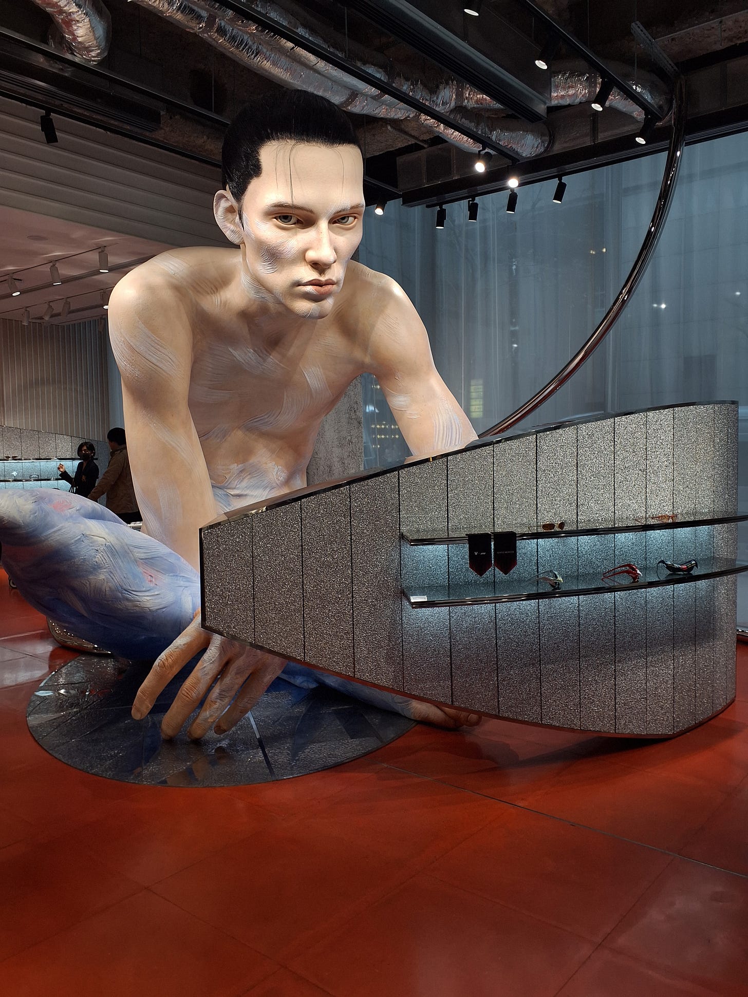 Die südkoreanische Luxus-Brillenmarke Gentle Monster schafft Erlebniswelten, in denen das Produkt, um das es eigentlich geht, fast beiläufig vorkommt. Die Läden ähneln durch die aufgestellten Kunstinstallationen eher einem Museum für moderne Kunst als einem Brillengeschäft. Zwischen Roboter-Köpfen, riesigen Bildschirmen, auf denen Videokunst abgespielt wird, und futuristischen Installationen finden sich die minimalistischen Brillenregale mit zuweilen ausgefallenen Modellen.