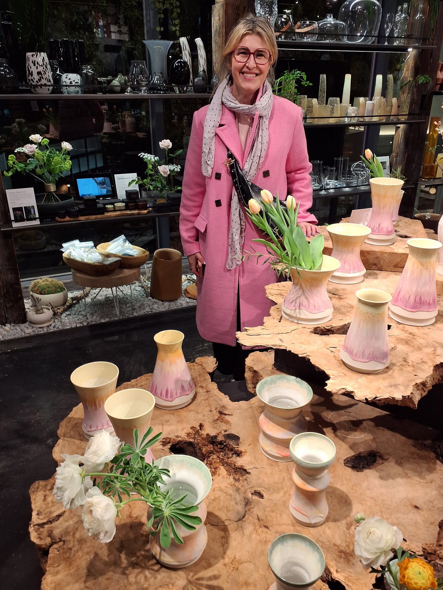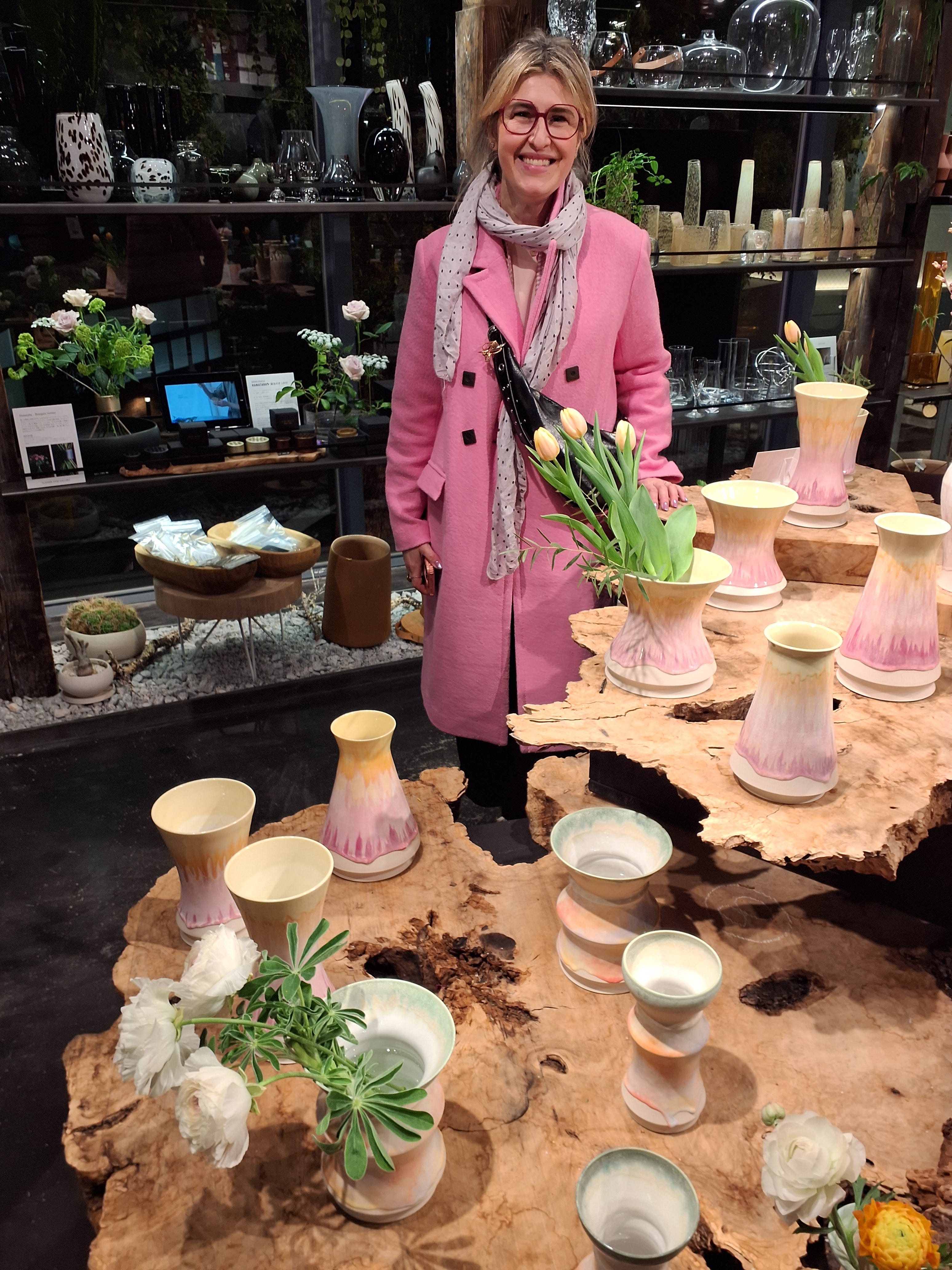 Diese Präsentation handgefertigter Hiuchi-Keramik auf einem Wurzelholztisch mit mehreren Etagen und fast 5 Metern Durchmesser gleicht einer Kunstinstallation. Es sieht mehr aus wie im Museum als in einem Laden!