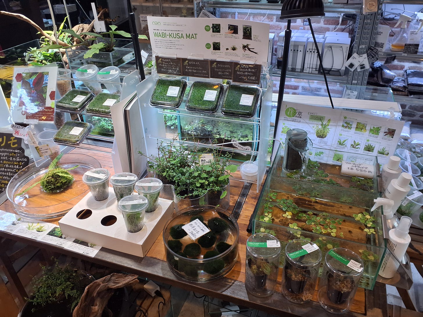 Moosquadrate in einer prominenten Präsentation angeboten. Ist Moos ein Impulskauf? Vielleicht! Mindestens für Wabikusa, die kunstvoll bepflanzten Mini-Landschaften in Glasgefässen. Sie bestehen aus moosbewachsenen Strukturen, die mit emersen (über Wasser wachsenden) Aquarienpflanzen bestückt sind. Eine beeindruckende Sortimentstiefe.