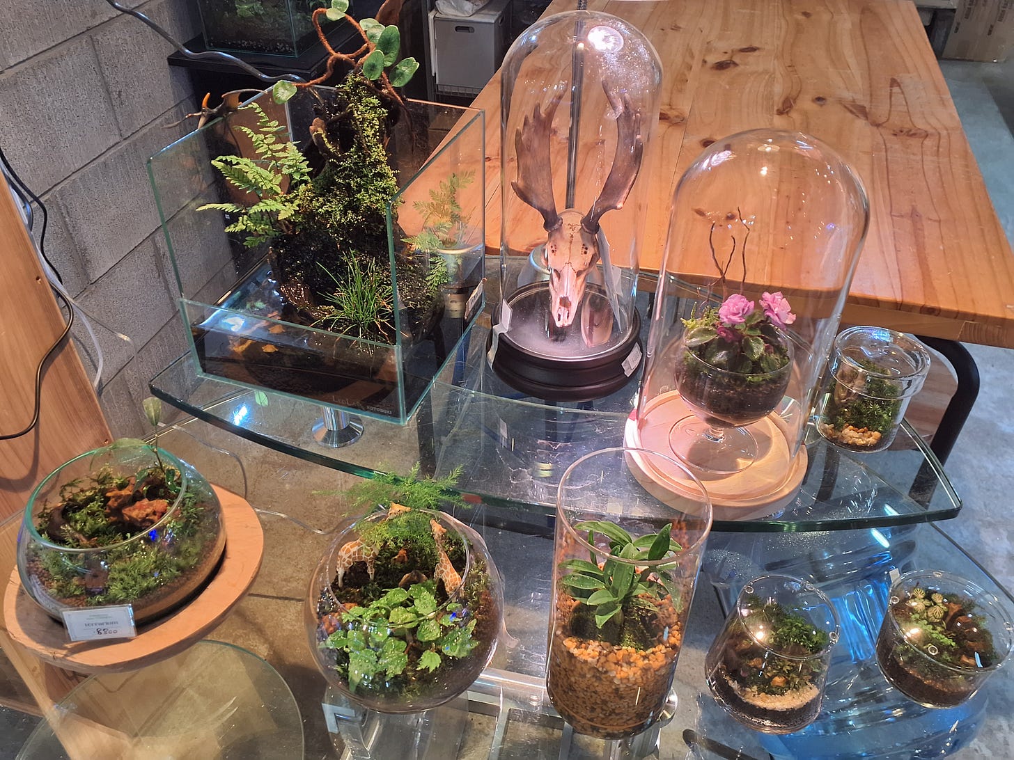 An jedem Verkaufstisch mit Pflanzen wird eine kleine, liebevoll arrangierte Kombination der am Tisch verfügbaren Pflanzen auf einem Podest kunstvoll präsentiert. Eine unglaublich charmante Inszenierung. Unweigerlich lässt man sich auf einen Rundgang ein, um keines dieser kleinen Kunstwerke zu verpassen.