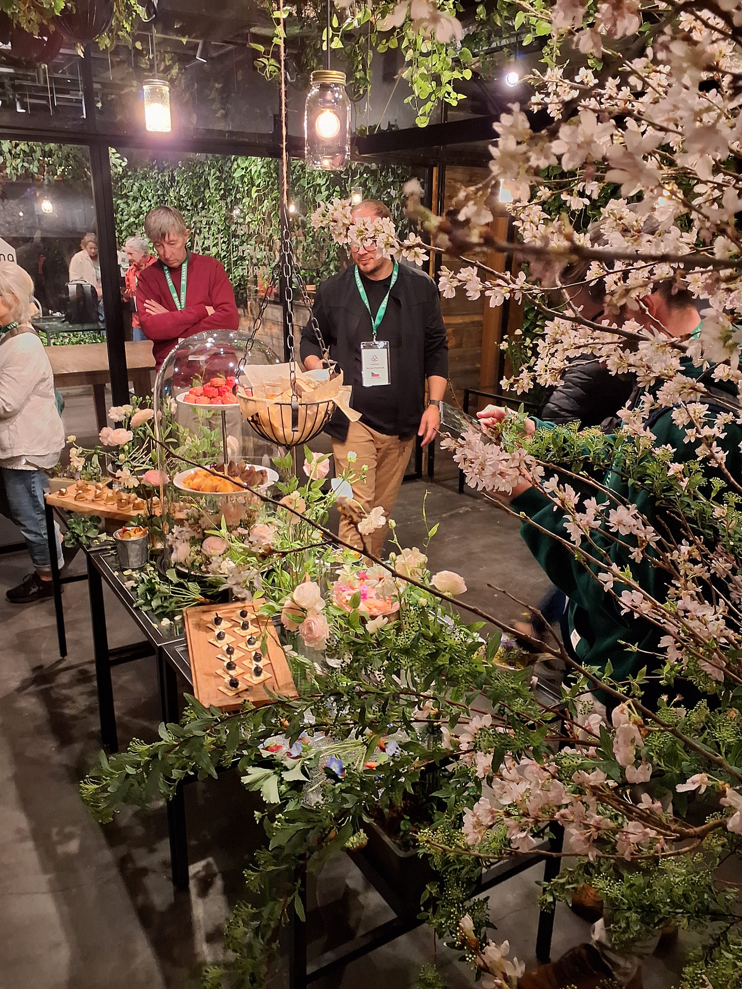 Unser Empfang zeigte Essen, das in Blüten, Laub und Glaskuppeln eingewebt war – ein Tableau, das die Grenze zwischen Floristik und Feinkost verwischte. Das Zentrumstück war eine mehr als 2,5 Meter hohe Vase mit blühenden Kirschblütenzweigen: atemberaubend!