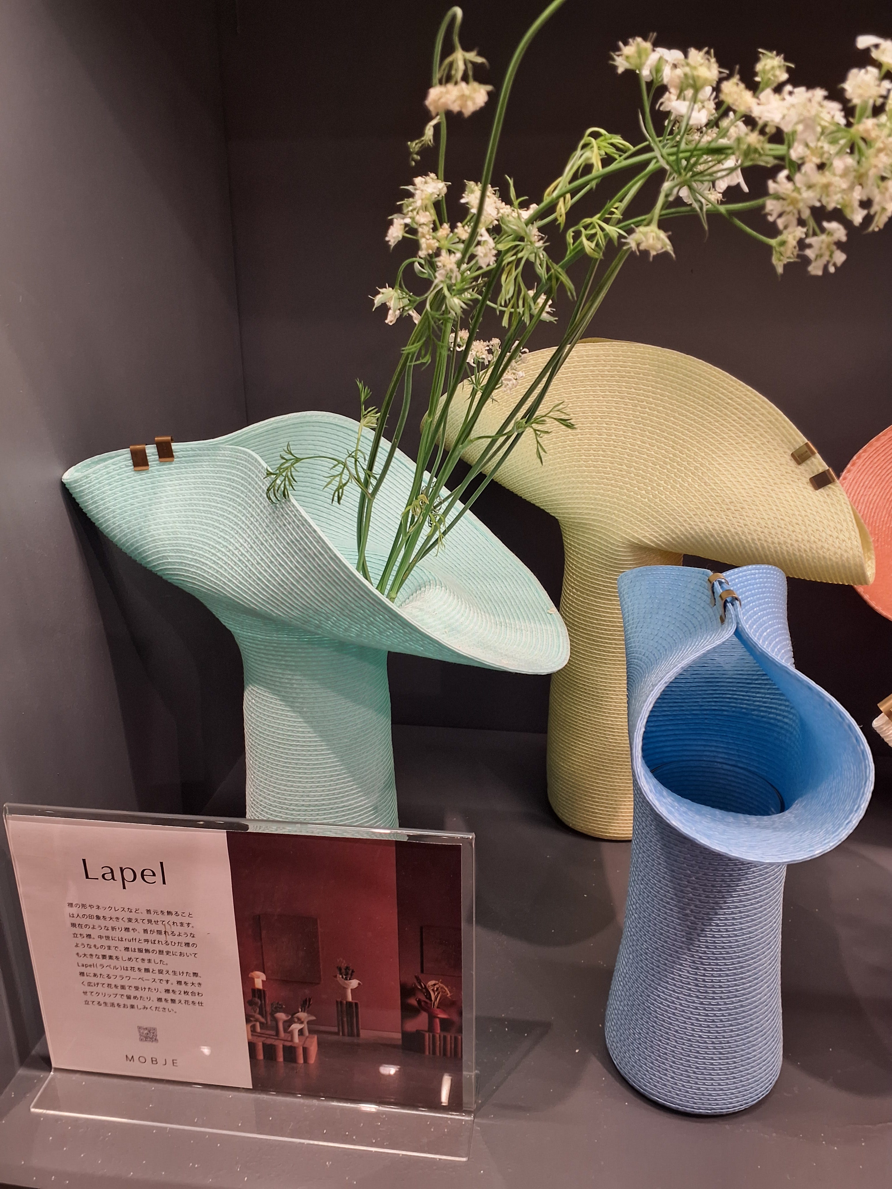 Funktionale Objekte, die zu Sammlerkunst in allen Regenbogenfarben werden. Zum Beispiel die ‘Lapel’ Vasen von Mobje (Material ist „Falthut”-gewebte Faser.) Preis ab ¥7.920+ (~CHF 40+).